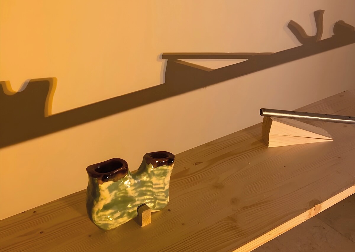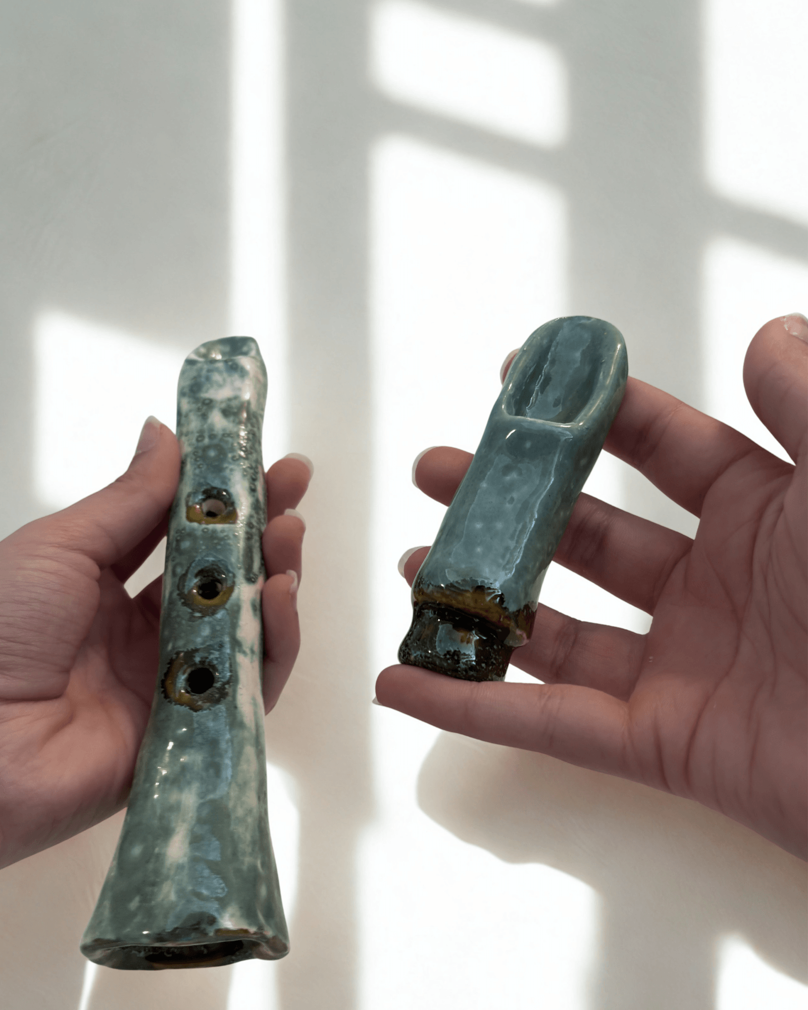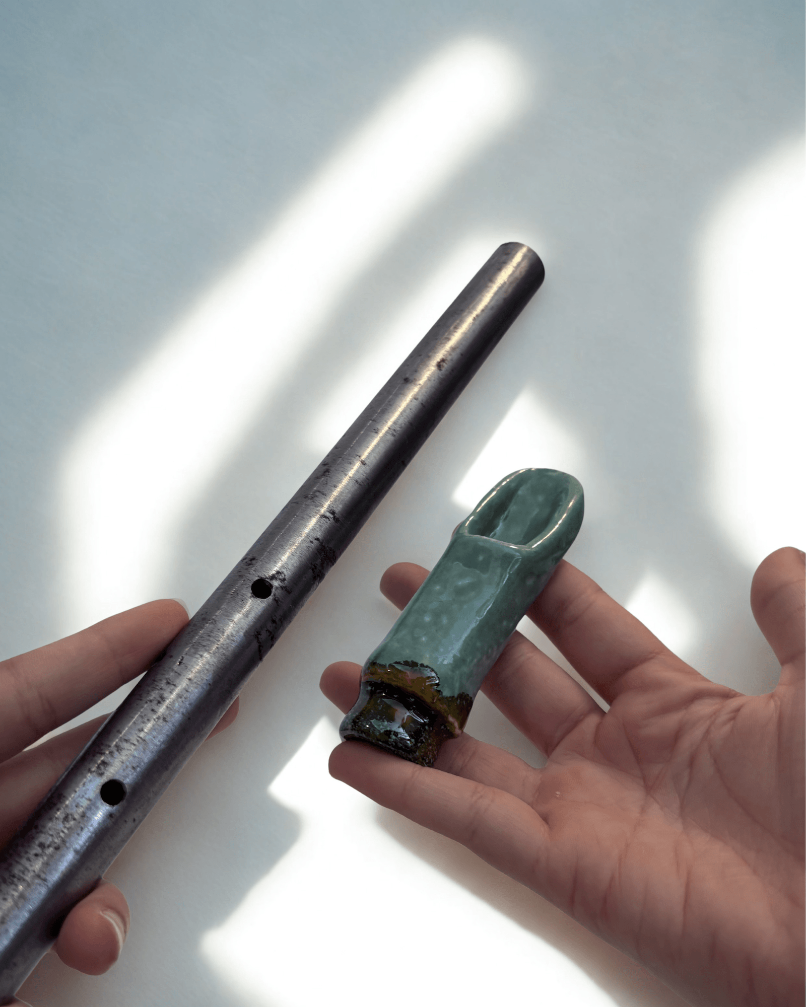The objects are built from contrasting materials: ceramic (soft, resonant) and iron (metallic, deep) — a fusion familiar to Indigenous ritual sound. Early prototypes paired iron bodies with saxophone and kazoo mouthpieces, mixing melodic, percussive, and buzzing timbres. The sound itself moves away from traditional tonality: atonal composition, looped, displacing harmonic expectation.