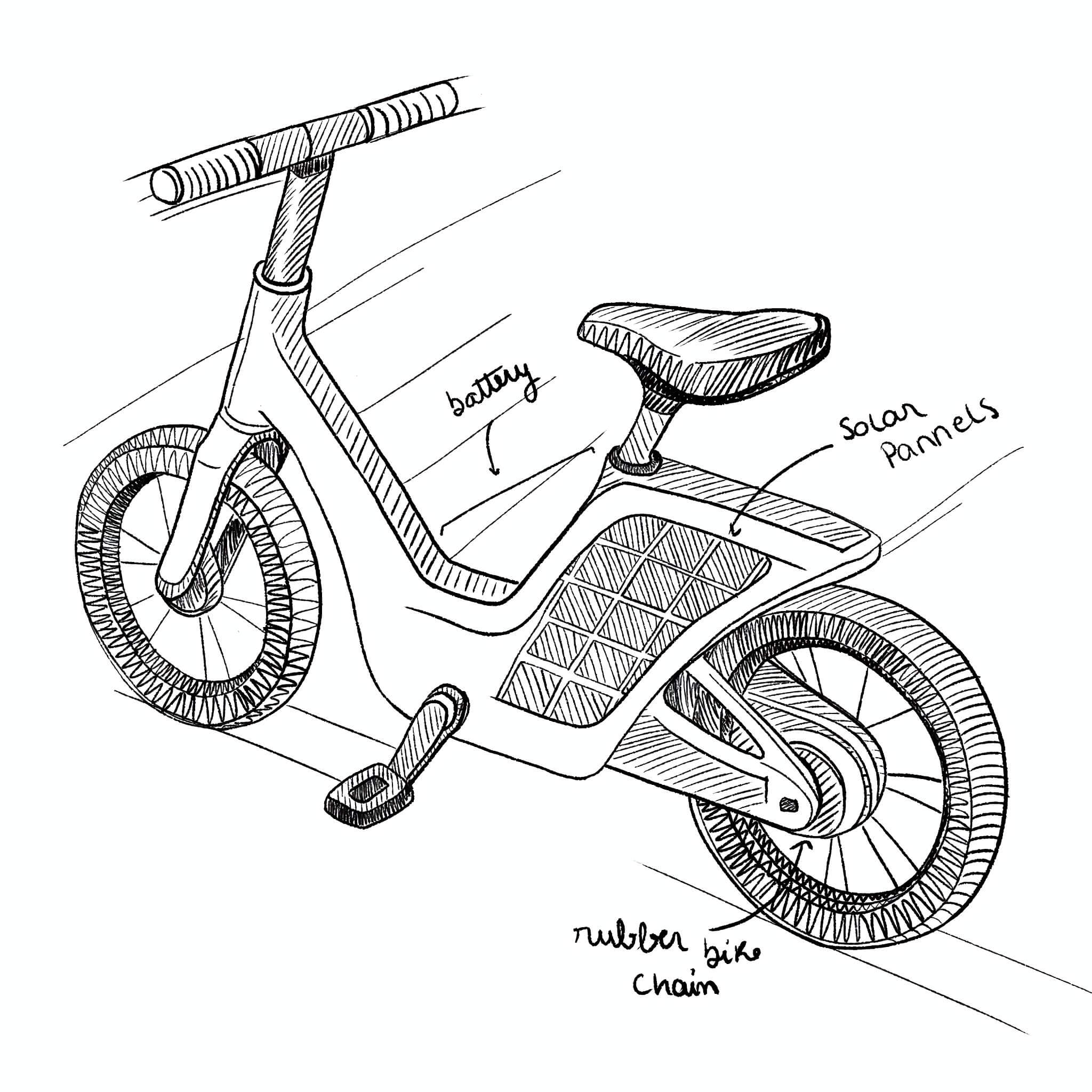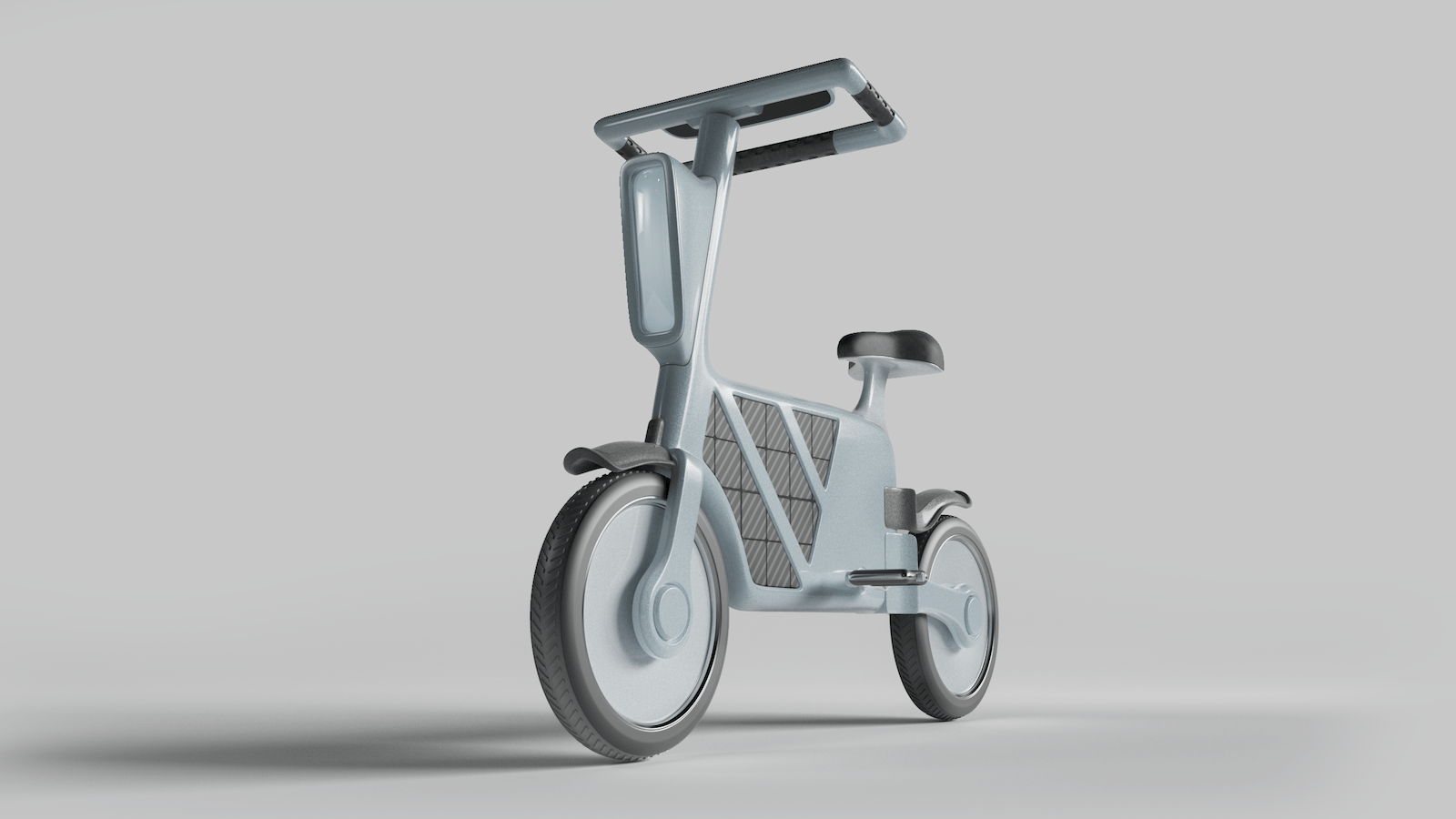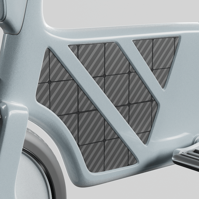 The proposal speculates on what urban mobility could look like in 2050 given trajectories in solar panel efficiency. A 1.0 m² surface operating at 30–35% efficiency would meet an e-bike's daily energy demand of approximately 400 Wh, making genuinely self-charging vehicles technically feasible at the timescale considered.
